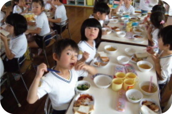 生活習慣が身につくように援助しながら手洗い・うがい後、食事の準備し楽しい食事をします。