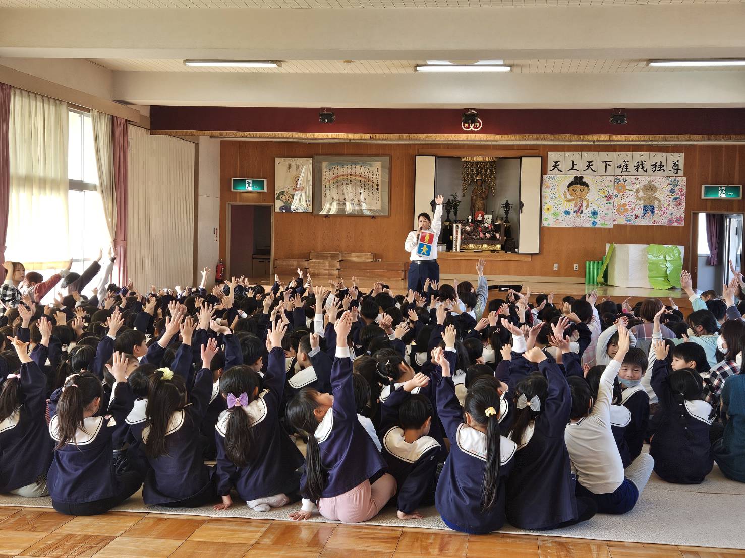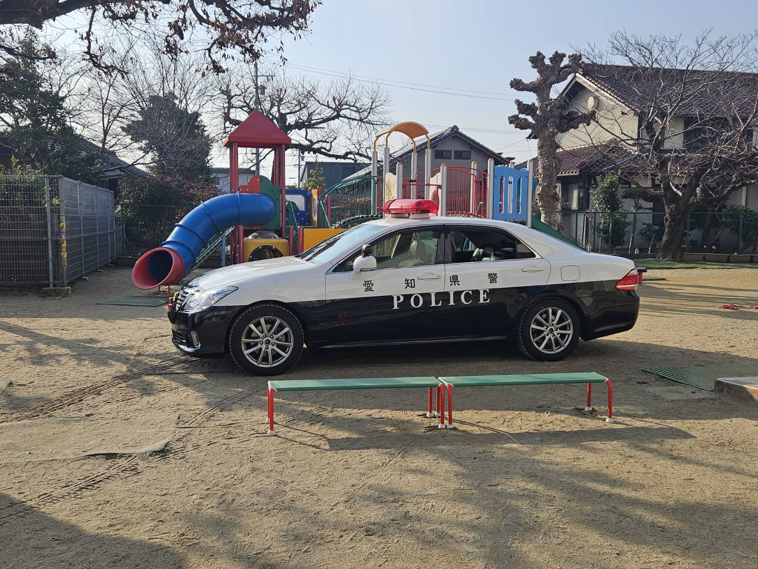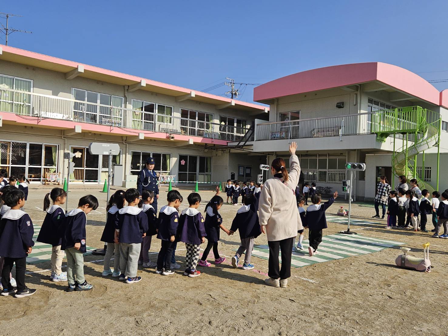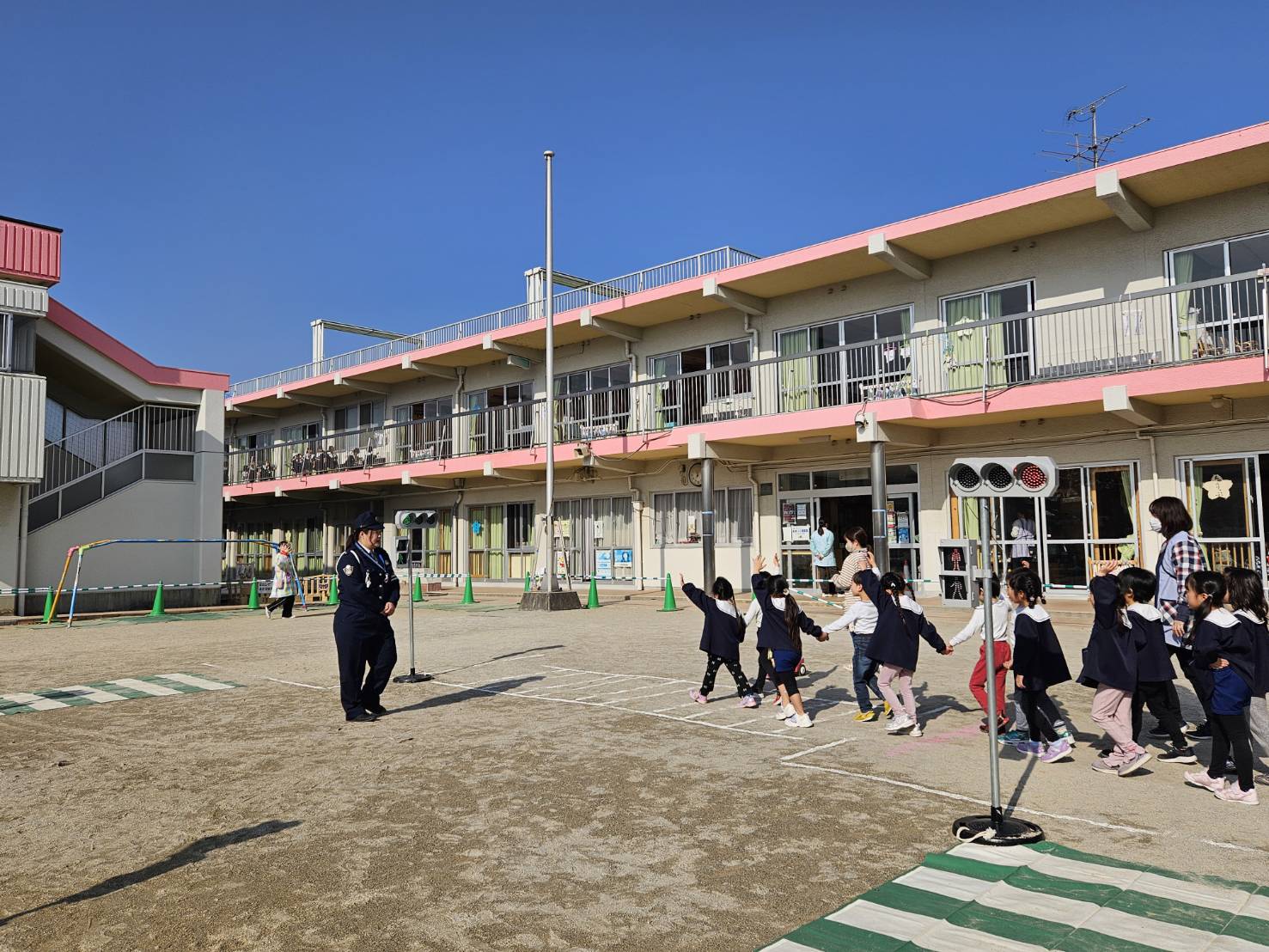 2026年1月20日 イベント津島警察署の警察官が来園し、子どもたちに信号機の意味や渡り方のルールを教えていもらいました。園庭には本物のパトカーが!!未満児クラスの子はパトカーの座席に座らせてもらい大興奮でした。年中・年長クラスの子たちは実際に信号機を見て横断歩道を渡る練習をさせていただきました。