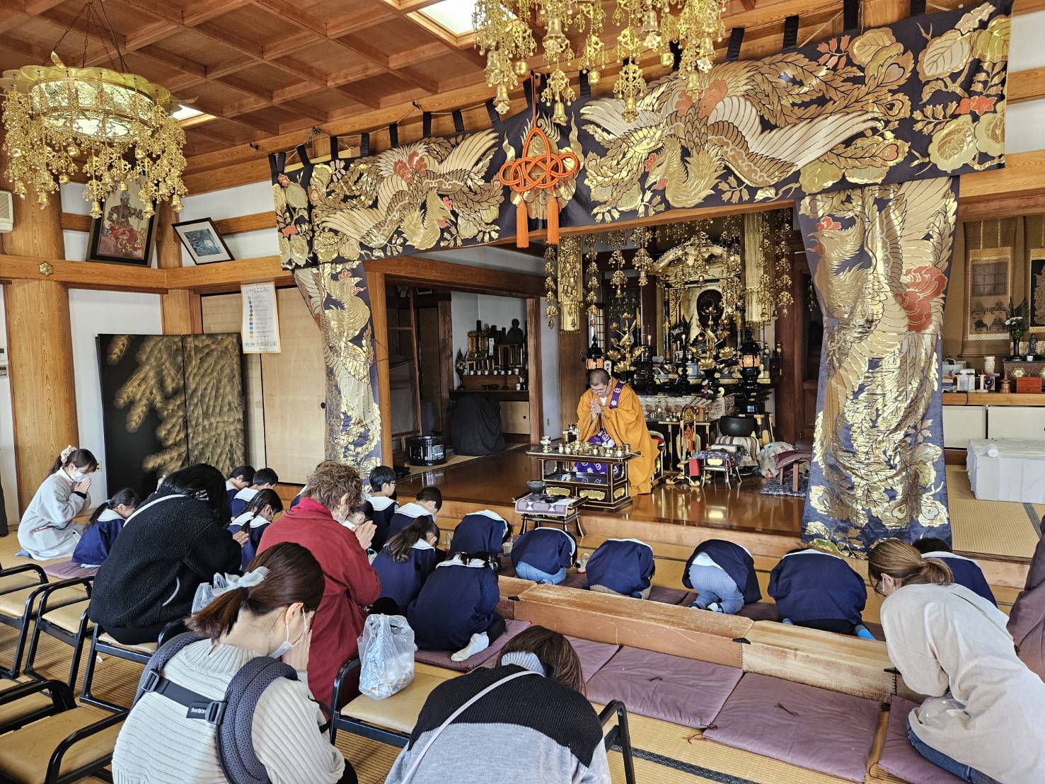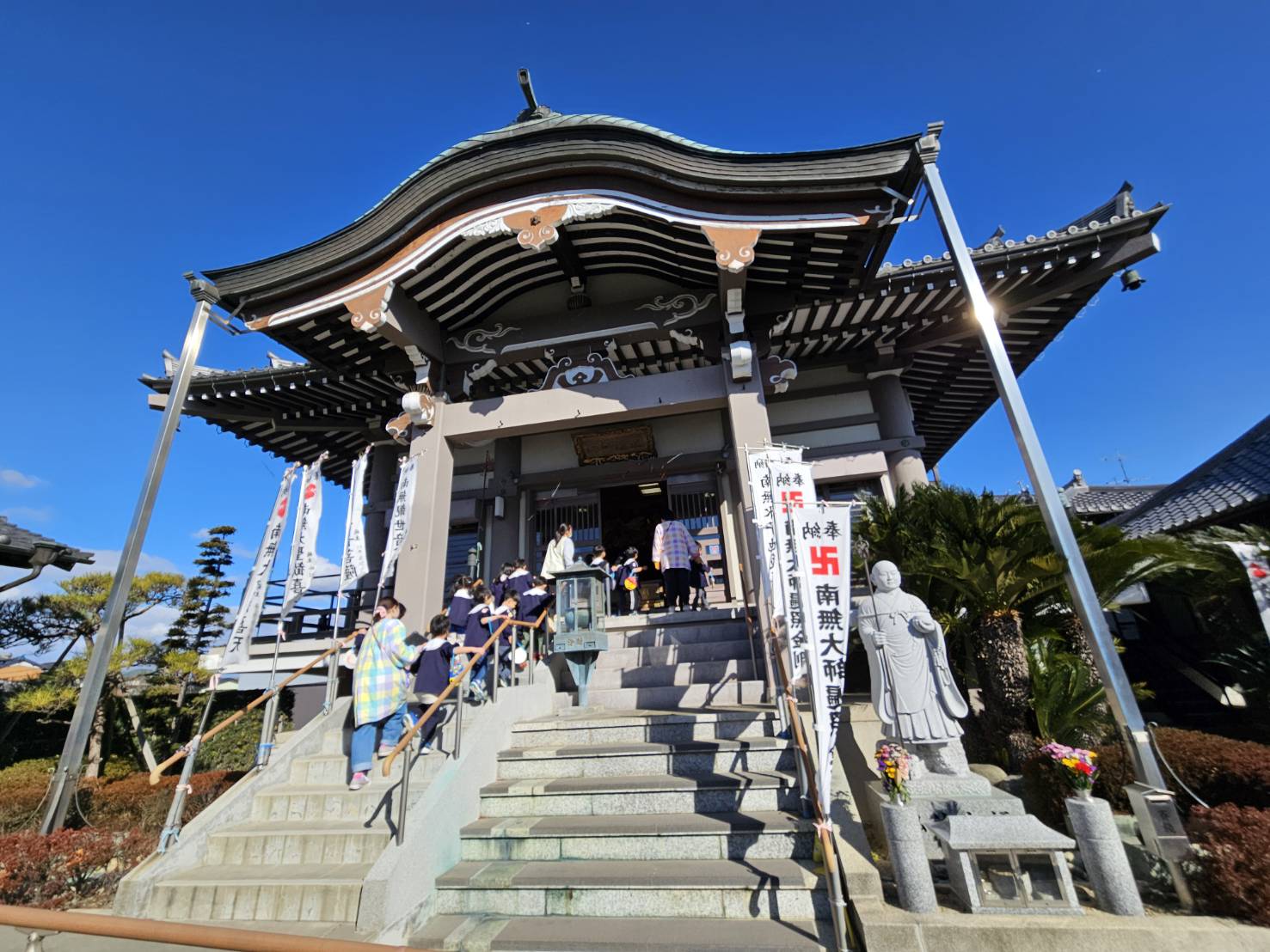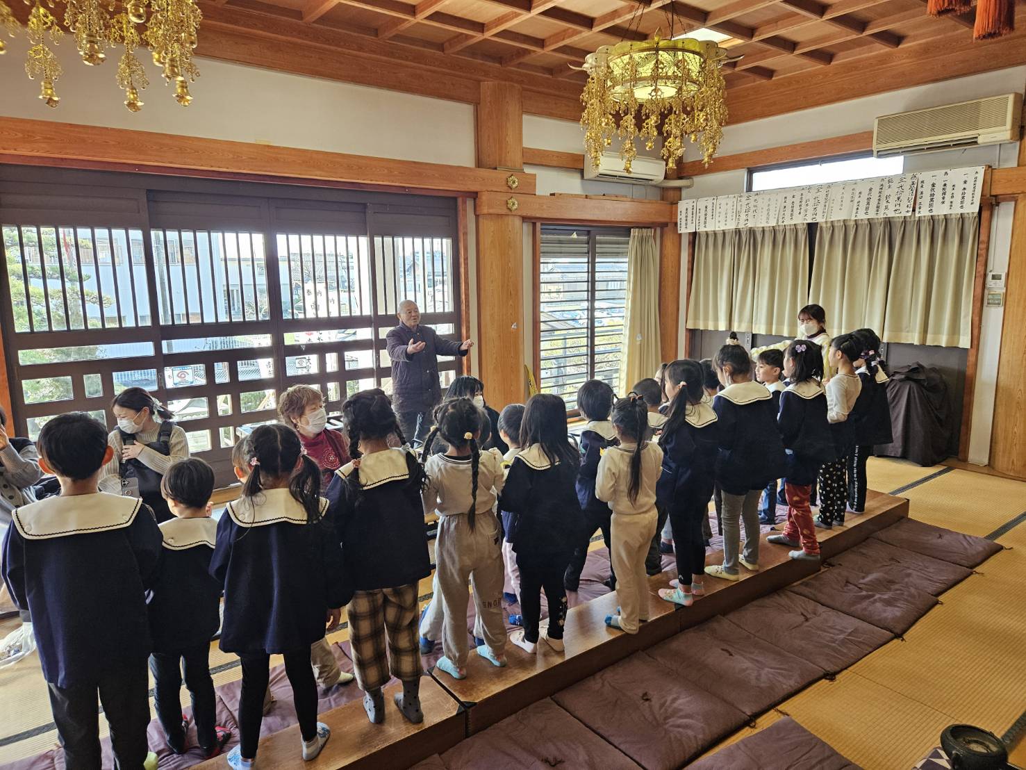 美和こども園の北側にあります長福寺で、地域の方を招いて節分会が行われました。幼児クラスの子どもたちが、住職の園長先生と一緒にお参りして、来て下さった皆さんに向かって「福は内!!」と豆まきをしました。